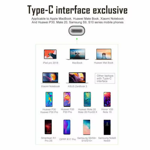 Καλή απαγωγή θερμότητας, αντοχή στην τριβή, ανθεκτικόΑποκλειστική διεπαφή τύπου CΙσχύει για Apple MacBook, Huawei Mate Book, Xiaomi Notebook και Huawei P30, Mate 20, κινητά τηλέφωνα της σειράς Samsung S9, S10 και φορητούς υπολογιστές με διεπαφή Type-C.