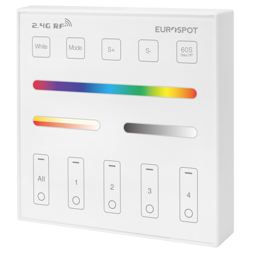 Το EuroSpot RF 2.4GHz επίτοιχο τηλεχειριστήριο είναι ένα τηλεκοντρόλ αφής για άμεσο και κομψό τρόπο διαχείρισης του Led φωτισμού σας. Κάνει χρήση ενός υψηλής ποιότητας πάνελ αφής, προσφέροντας άμεσο έλεγχο των ζωνών καθώς και των χρωματικών τόνων για RGB/ RGBW/ RGBCCT led-ταινίες αλλά και της θερμοκρασίας και φωτεινότητας χρώματος.