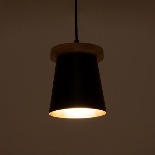GloboStar® LANA 01424 Μοντέρνο Κρεμαστό Φωτιστικό Οροφής Μονόφωτο με Ξύλινη Βάση και Μαύρο Καπέλο Φ13 x Y17cm