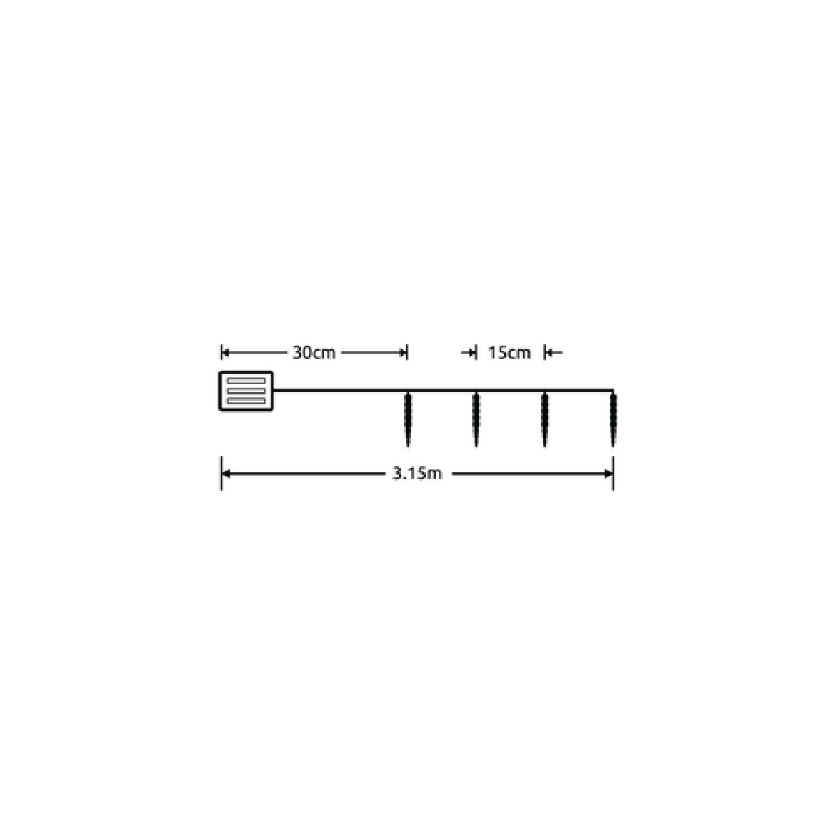 Χριστουγεννιάτικη γιρλάντα LED με θερμό λευκό φως, ιδανική για διακόσμηση εσωτερικών χώρων. Διαθέτει 20 LED σε μήκος 3.15 μέτρων (με το φίς) με απόσταση 15cm μεταξύ των λαμπτήρων. Λειτουργεί με μπαταρίες 3xAA (1,5V) (δεν περιλαμβάνονται), προσφέροντας ευελιξία στην τοποθέτηση χωρίς καλώδια.
