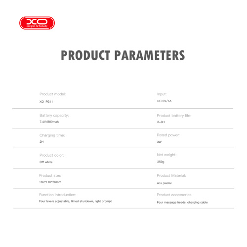 Λεπτομέρειες ΠροϊόντοςΜοντέλο προϊόντος: XO-FG11Είσοδος: DC 5V/1AΧωρητικότητα μπαταρίας: 7.4V / 800mAhΔιάρκεια χρήσης: 2-3 ώρεςΧρόνος φόρτισης: 2 ώρεςΟνομαστική ισχύς: 3WΧρώμα προϊόντος: ΜπεζΚαθαρό βάρος προϊόντος: 359gΔιαστάσεις προϊόντος: 160 × 116 × 60mmΥλικό κατασκευής: ABS πλαστικόΛειτουργίες: Τέσσερις ρυθμιζόμενες ταχύτητες, χρονοδιακόπτης, ένδειξη φωτισμούΠαρελκόμενα: Τέσσερα κεφάλια μασάζ, καλώδιο φόρτισης