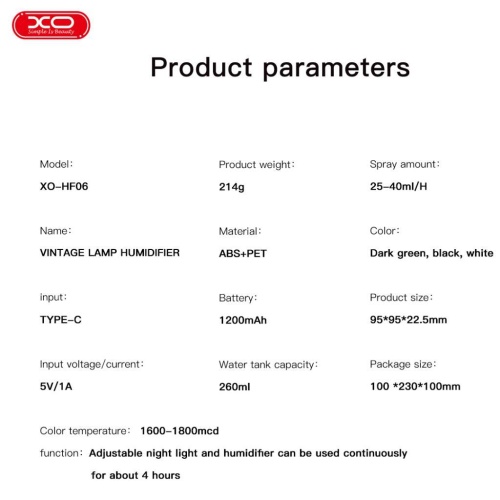 Χωρητικότητα μπαταρίας: 1200mAhΕίσοδος USB-C: 5V/1AΧωρητικότητα δεξαμενής νερού: 260MLΔιαστάσεις προϊόντος: 95 x 95 x 225MMΚαθαρό βάρος προϊόντος: 236GΥλικό: ABS, PETΧρόνος χρήσης: ψεκασμός + φως περίπου 5 ώρες, μόνο φως περίπου 15 ώρεςΧρώμα: μαύροΛειτουργίες: ρυθμιζόμενο φως νυκτός, υγραντήρας με ψεκασμόΑξεσουάρ: συσκευή x1, καλώδιο φόρτισης x1, ανταλλακτικό βαμβακερό φίλτρο x1