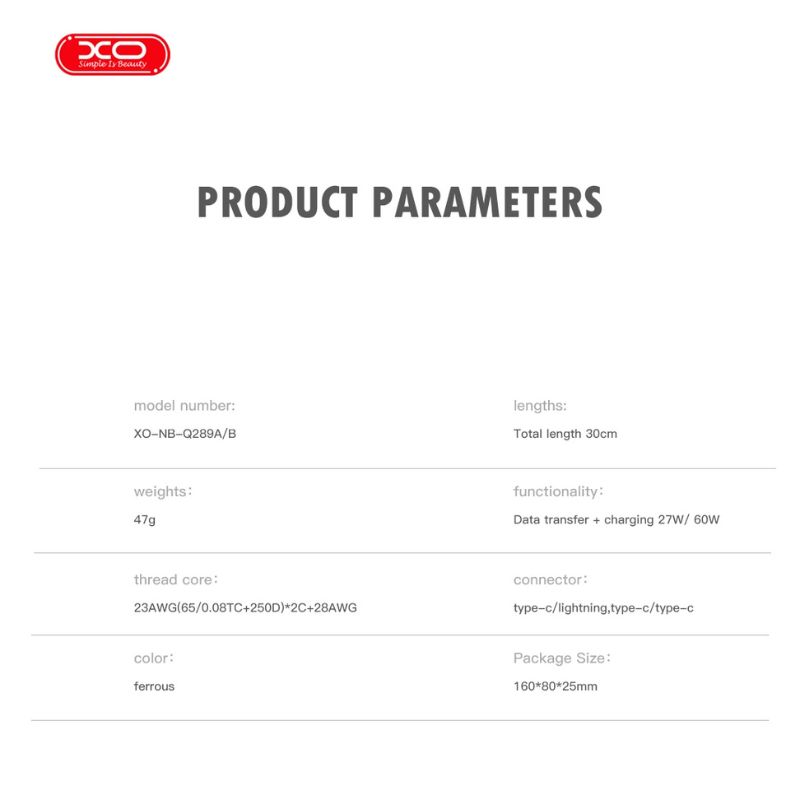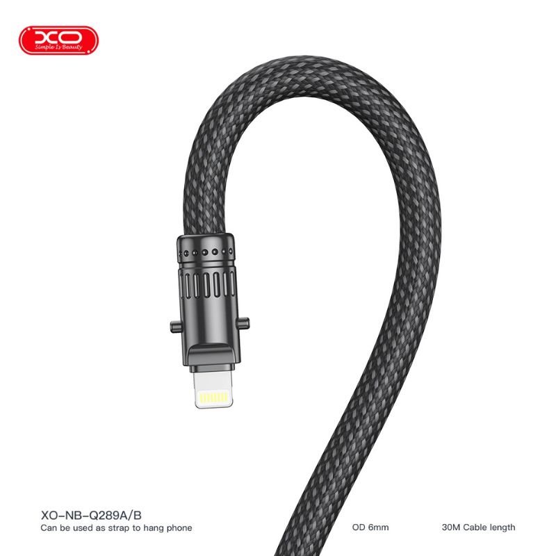 Product DetailsModel: XO-NB-Q289A(C-L)Weight: 47gCore: 23AWG(65/0.08TC+250D) x 2C+28AW G(1 6/0.08TC+250D) x 3Ccore material HDPE in the foamed silicone 48 braided outer being OD: 6.0MM L=0.2M environmental protection in line with ROHSColor: BlackLength: Total length 30cmFunction:Lightning data transmission & charging 27WInterface: Lightning